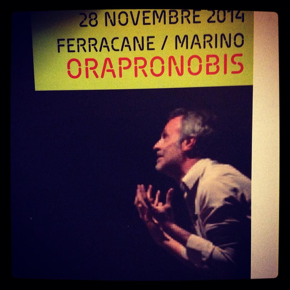 Orapronobis, spettacolo nato nel 2012, in cui il regista Rino Marino, psichiatra di professione, traccia il profilo di un uomo, una vita fallita e il disagio psichico che divora, che fà i conti con sé stesso. E con la fede, lontano mille miglia da una Chiesa del potere temporale, che predica in un modo e razzola in un altro, che gira lo sguardo di fronte alle guerre e alle dittature che devastano interi Paesi, che ha tradito radicalmente il messaggio dei Vangeli.