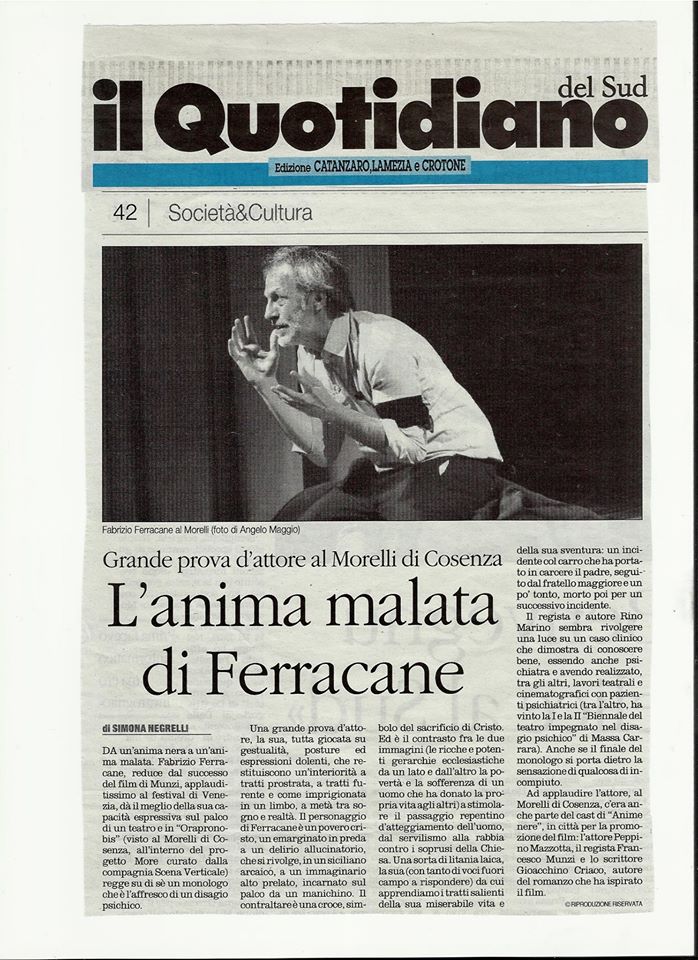 La platea del teatro “Morelli” di Cosenza ha accolto con entusiasmo lo spettacolo del regista di Castelvetrano, euforia fomentata dalla presenza in platea di Francesco Munzi regista del film “Anime nere” in cui Ferracane ha recitato il ruolo di Luciano, e dell’attore Peppino Mazzotta. Insieme all’attore il regista e autore del testo Rino Marino.
