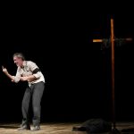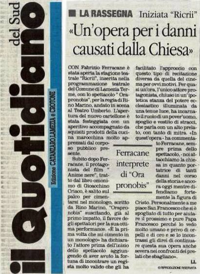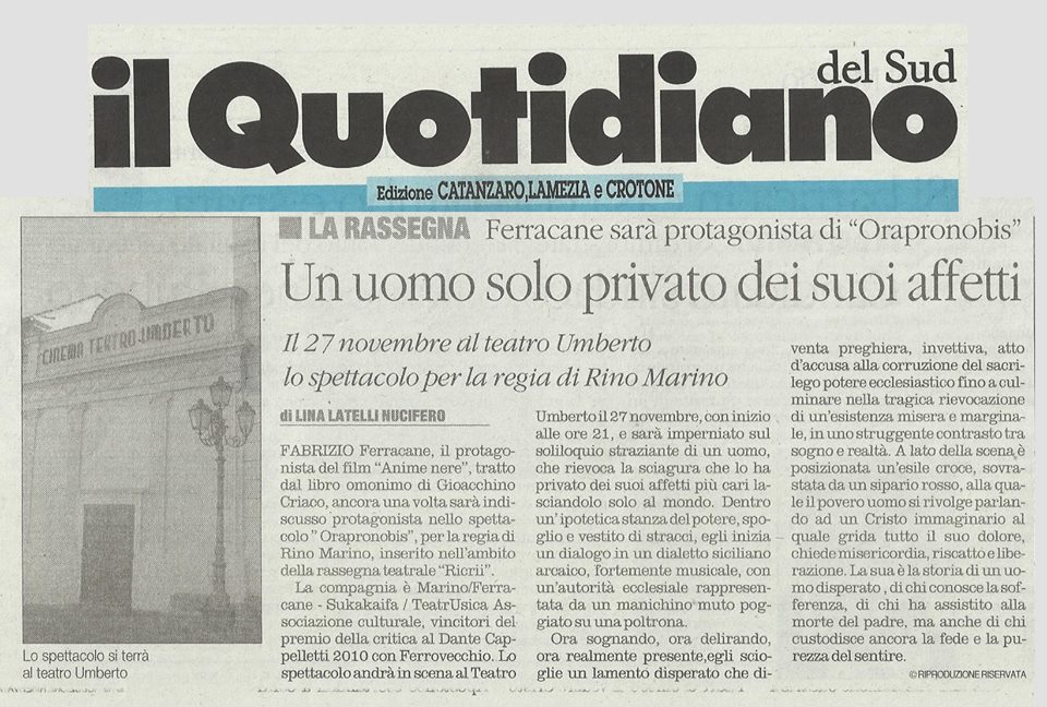 “Orapronobis è un dramma psichiatrico, è un soliloquio spacciato per dialogo con una eminenza ecclesiale (viene da pensare ad una sorta di papa nero se si guarda il manichino-sedia realizzato per lo spettacolo che da le spalle al pubblico), che vede in Ferracane un personaggio emarginato dalla società. Messo ai margini dagli altri per le condizioni psicologiche in cui versa e inevitabilmente finito anche ai margini di se stesso per “il lavoro” della sua mente. Il pover’uomo parla e parla molto e, come spesso accade sia nella vita che nel teatro, capita agli “sciocchi”, ai “fuori di testa”, di dire verità scomode. Si trova davanti all’alto prelato e pone mille domande in un siciliano arcaico, analizza la condizione umana e della chiesa. Non ottiene risposte e anche se avesse avuto davanti un altro attore piuttosto che un manichino, la sensazione è che non avrebbe comunque ascoltato una sola parola dall’interrogato. Silenzio e oscurità, sogno e realtà, miseria e marginalità, verità e bugie; sono tanti i duelli concettuali del testo di Marino e che Ferracane recita come un doloroso lamento. Snocciola un rosario di quesiti che portano il protagonista a dover fare i conti con se stesso. Solo, con l’oscurità come unica compagnia.”